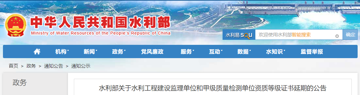 水利部關于水利工程建設監理單位和甲級質量檢測單位資質等級證書延期的公告